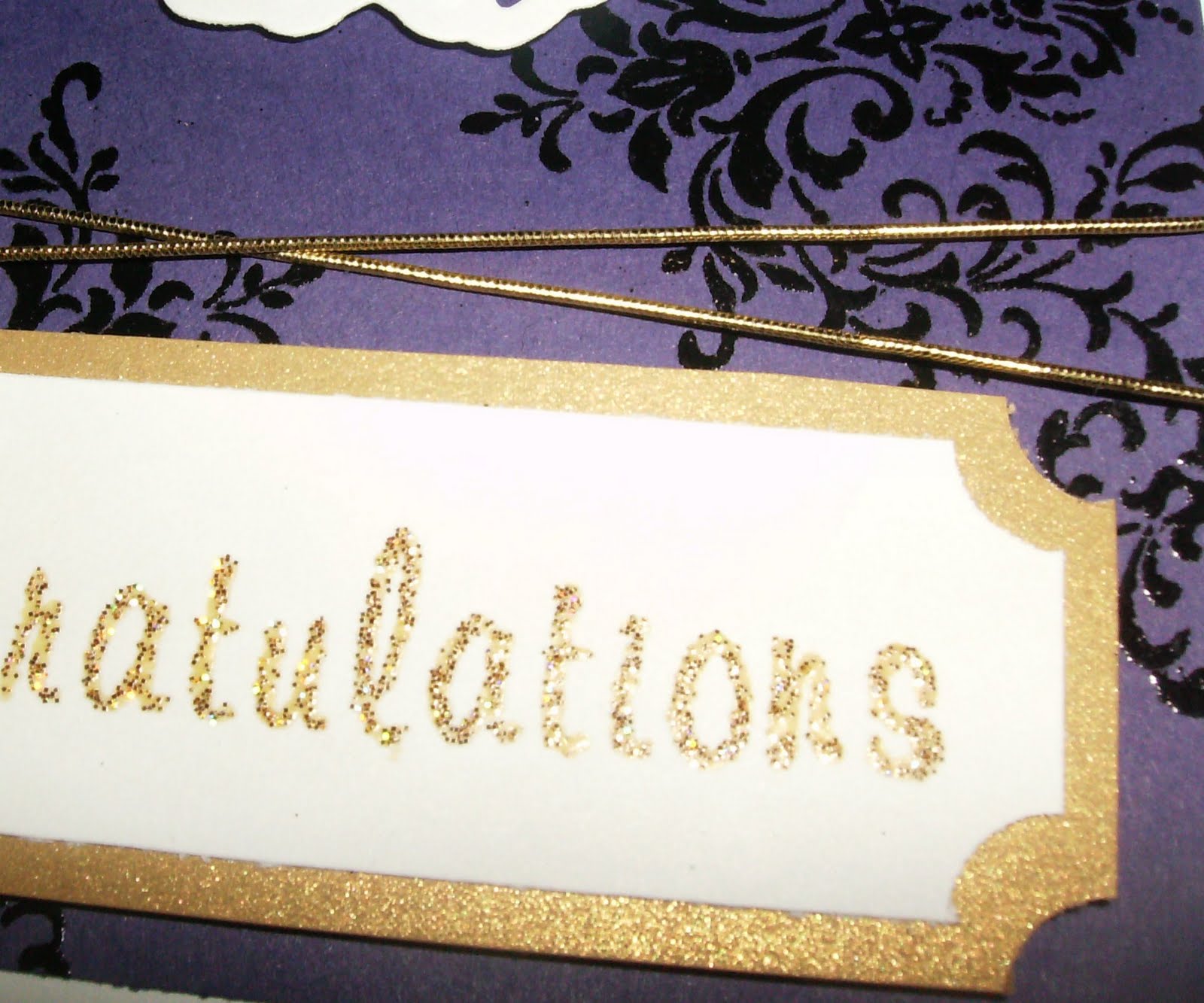 Embossed the deep purple cs with Versamark and black embossing power. Wrapped it with gold cording. (Their colors are purple and gold).